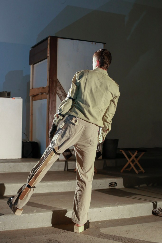 Geschnitzte Holzobjekte werden an Füßen, Bein und Arm zur Einschränkung der Beweglichkeit des Performers befestigt. Er humpelt und schafft es nur unter großer Anstrengung, den anderen Performer aus dem Raum zu schleifen.