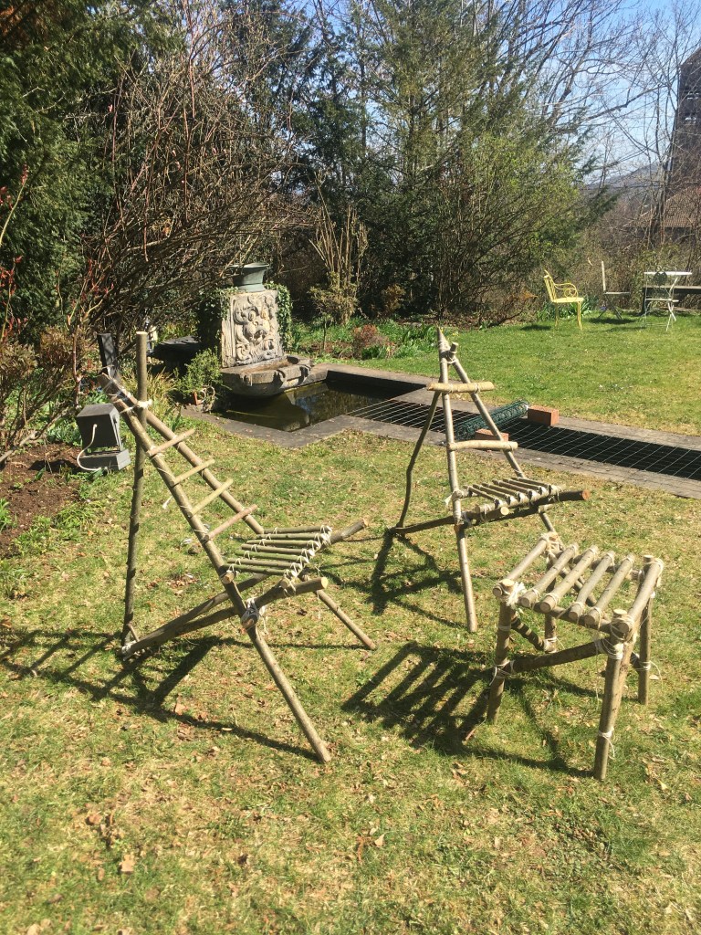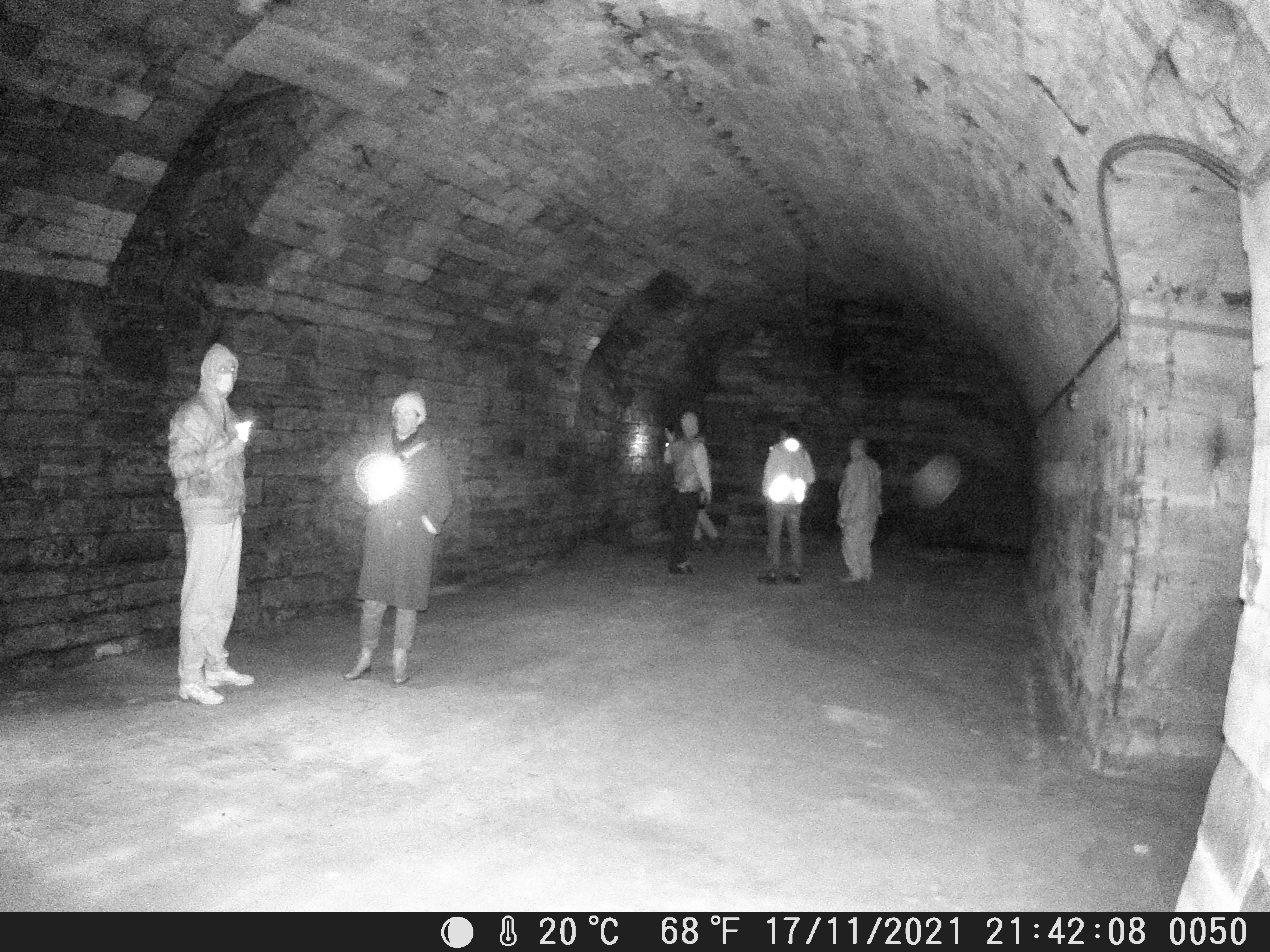 The exhibition space, a vaulted cellar, is staged as a hybrid survival setting. Once settled under the tarp, the eyes of the visitors become accustomed over time and orient themselves: logs piled up in front of the feet to form a campfire, in which a cell phone is embedded, over whose screen a tick runs again and again to a quiet chirping. A kind of chair made of sticks in the light of a flashlight, which casts a cryptic sign as a shadow on the ground…