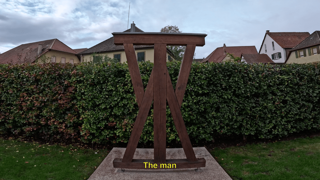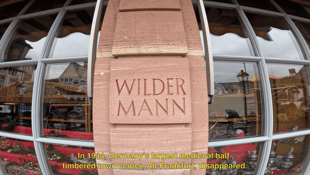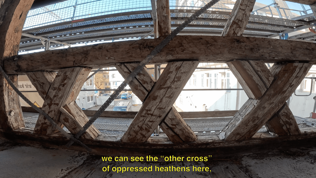 The video essay Runenhäuser takes up the nationalist-esoteric charge of half-timbered houses as “rune houses” and as backdrop-like reconstruction architecture, using the example of Frankfurt’s new old town. Continuities and ruptures become visible between historical architecture, homely backdrop, and contemporary reconstruction: to this day, individual struts are interpreted as supposed runes on tourist information boards such as those on the German Half-Timbered Road. The houses filmed along the German Half-Timbered Road bend in the curvature of the camera lens – how stable is which construction?